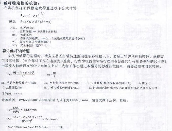 升降機的容許_載荷、容許(xǔ)外加(jiā)負載、容許絲杆軸(zhóu)的旋轉(zhuǎn)速度等項目進行(háng)效驗,如_過產品(pǐn)的數據將會對整個升降(jiàng)設備造(zào)成重大(dà)損傷。