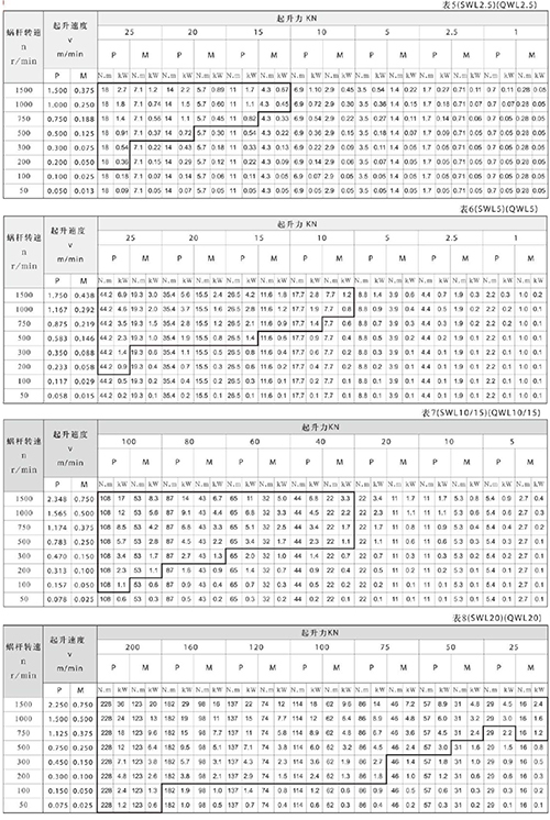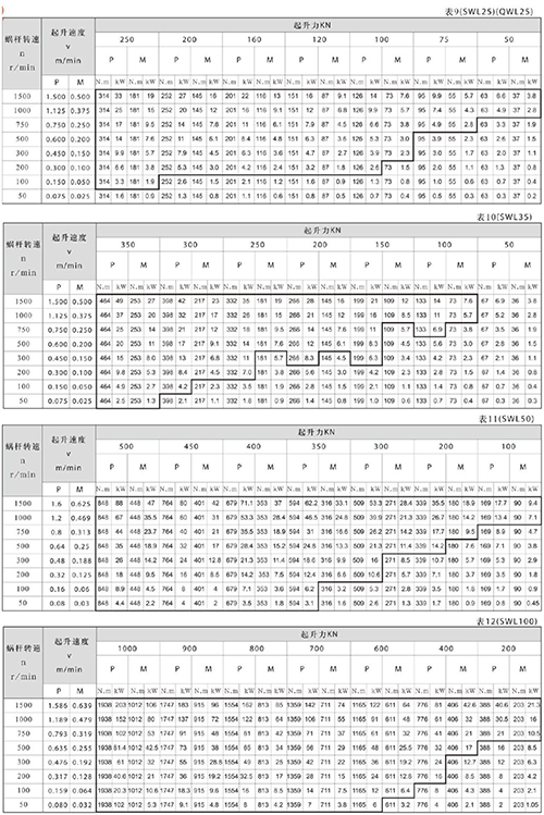 表5~表13是各型號螺杆傳動(dòng)的許(xǔ)用起(qǐ)升速度、扭矩(jǔ)和功率,其參數適合用於環境溫度為20°C、工作持續率為20%/h或30%/10min的條件下(xià);對粗線範圍內的參數,使用時升降機會產生過熱,應盡量避免選用,否則_采取有效措施。根據螺杆(gǎn)起升負荷及起升速度,按照下列公式計算升降(jiàng)機(jī)的驅動功率(lǜ),再查表5~表(biǎo)13,查出所需升降機型號。