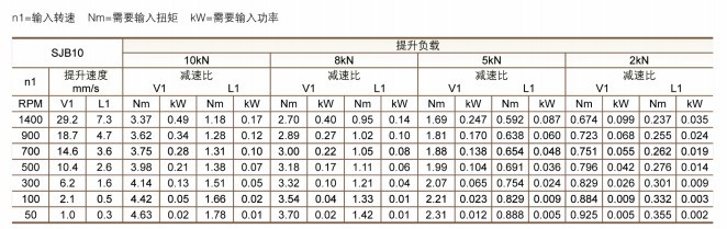 SJB10滾珠螺旋升降機的提升能力為2KN~10KN,額定動載11KN,絲杆直徑20,蝸輪蝸杆減速比V1=1:4、L1=1:16,蝸(wō)杆輸入1轉(zhuǎn)絲(sī)杆行程為V1=1.25mm、L1=0.31mm,_輸入功率為V1=0.57KW、L1=0.27KW,滿載啟動扭矩V1=4.8Nm、L1=1.8Nm,啟(qǐ)動效率V1=41、L1=1.8,1500rpm時的(de)運(yùn)轉效率V1=59、L1=42,箱(xiāng)體重量為6kg。