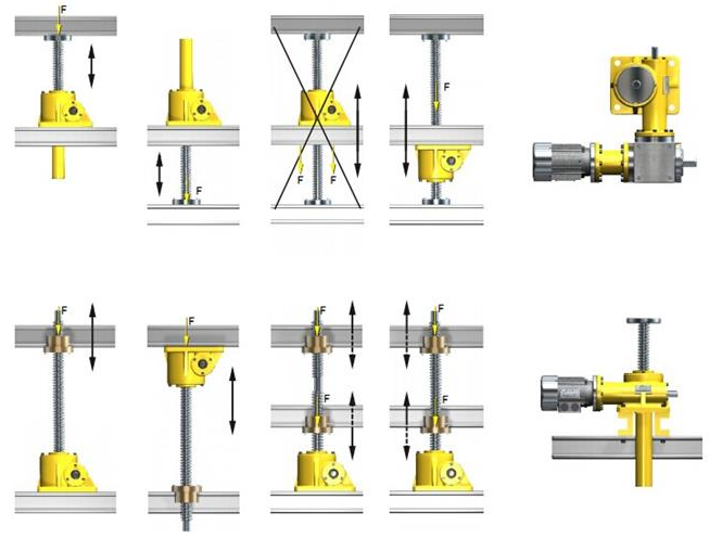 螺旋絲杆升降機安裝時(shí)應注意不同結構型式、不同頭部型式的安裝(zhuāng)方法,錯誤的安裝方法將會對絲杆升降機造成(chéng)嚴重的損壞。下麵我們(men)來通過幾張圖例了解一下蝸輪絲杆升(shēng)降機(jī)的安裝注意事項: